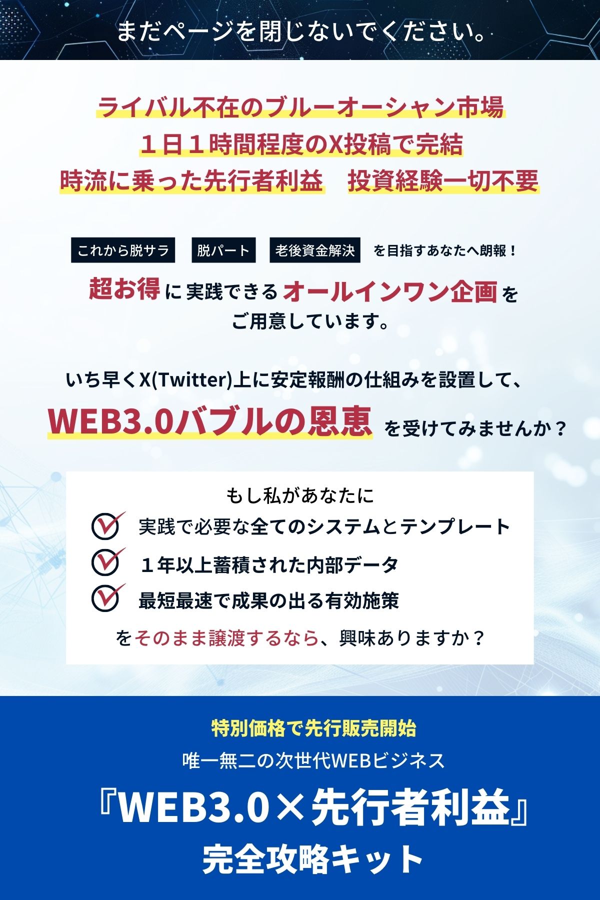 WEB3.0ジャンルというブルーオーシャン市場で、確立されたデータと反応の取れるテンプレを駆使して毎日のポスト作業を繰り返していけば、人生レベルで変わるほどの安定報酬を掴めるでしょう。